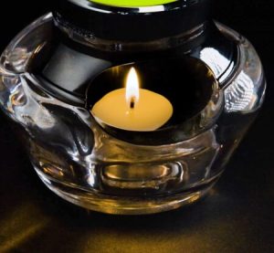 The light of the candle refracts through the clear cast glass base.