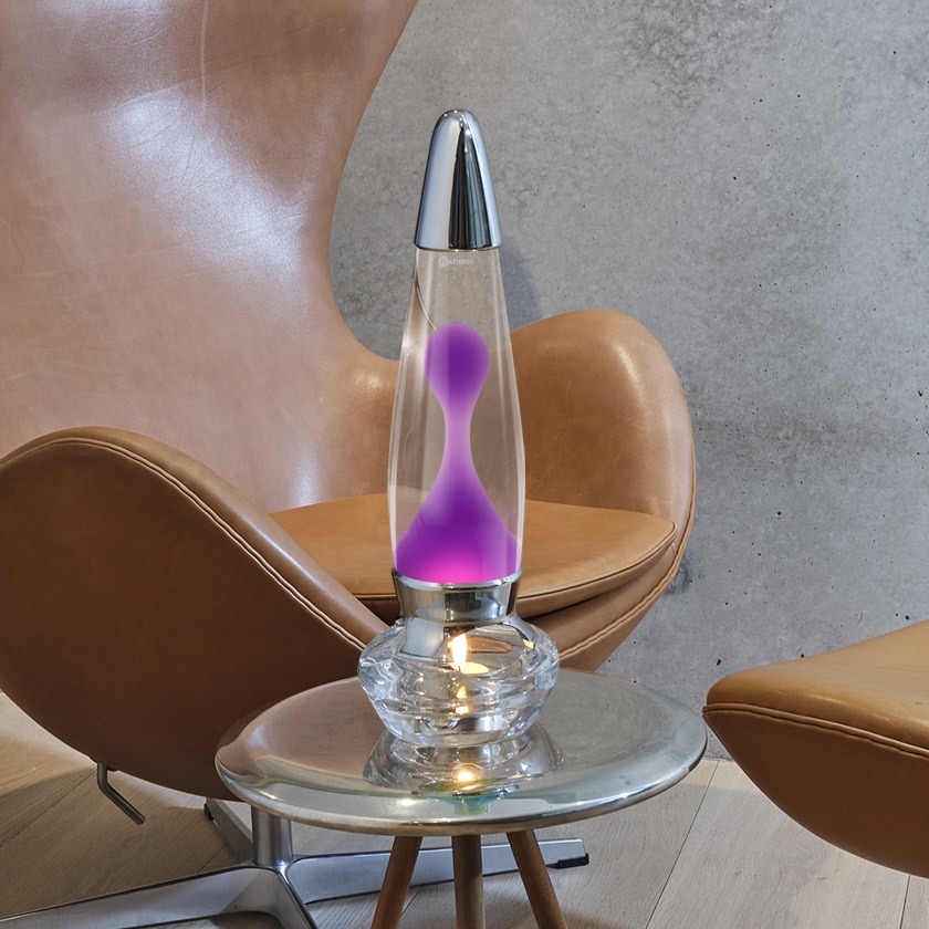 Evo is the largest in our unique range of candle-powered lava lamps. It works with regular tea lights, and we include three in the gift box. Evo has no wires and can be placed anywhere in the home. Evo is made of clear cast glass and chromed cast metal.